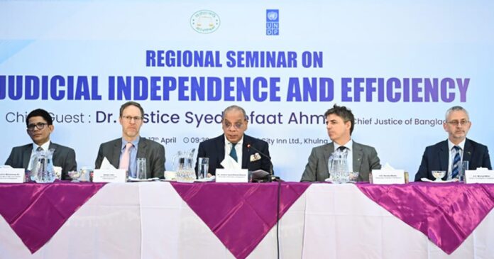 শনিবার (১২ এপ্রিল) খুলনার একটি হোটেল ‘জুডিসিয়াল ইন্ডিপেন্ডেন্স অ্যান্ড এফিসিএন্সি ইন বাংলাদেশ’ শীর্ষক সেমিনারে প্রধান অতিথির বক্তব্য তিনি এ কথা বলেন। বাংলাদেশ সুপ্রিম কোর্ট ও ইউনাইটেড নেশনস ডেভেলপমেন্ট প্রোগ্রামের (ইউএনডিপি) যৌথ উদ্যোগে এ আয়োজন করা হয়।